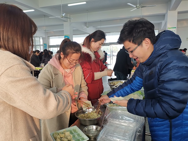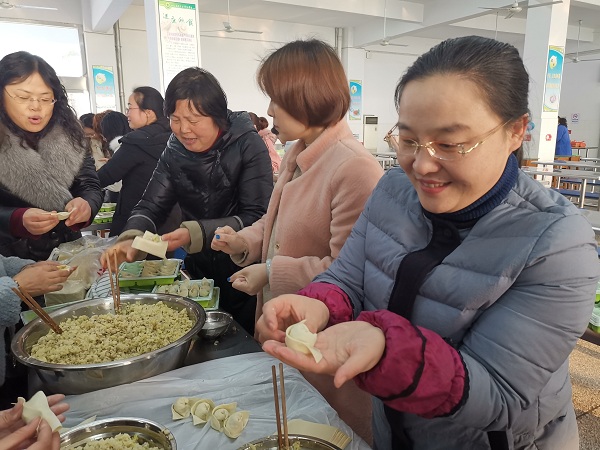这天,阳光明媚,连日的阴雨绵绵走了,东青实验学校的课堂是明媚的,食堂也是别样的。3月4日下午4点半,全校教师走进食堂,预祝三八节。净手、擦干、包起……一个个女教师撸起袖子,包起了馄饨。拿皮、蘸水、放馅、卷起……一个个胖乎乎的“元宝”就出来了。别看老师们站在讲台上那样的云淡风轻,此时的她们可是烟火味满满,动作干脆利落,谈笑间从容搞定。上得讲台,入得厨房……真是生活的多面手!