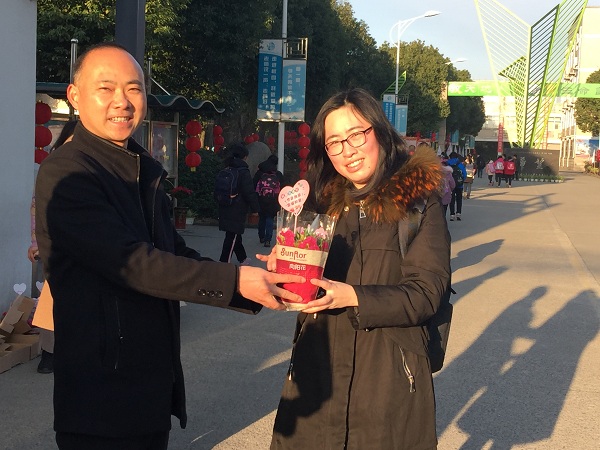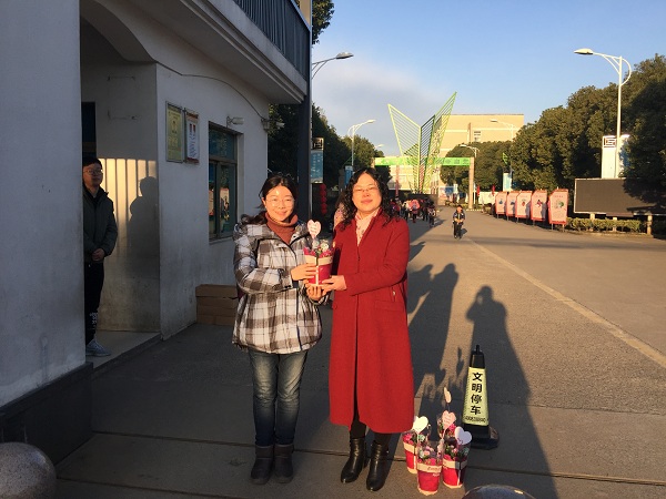 3月8日,清晨的第一缕阳光照在东青实验学校女教职工的脸上,温暖着她们的心田。你看,校长们手捧鲜花,站在校门口,给每位女教师送上真诚的祝福——“鲜花很美,你们更美!”花儿用绚丽的色彩、芬芳的气味,明媚了整个春天。花儿送美女,靓丽了每位女教师的脸庞,生动了她们的眼眸。