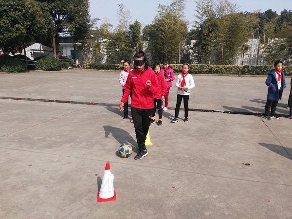 团辅的高潮出现在“盲人运球绕杆”游戏。每个小队派出两人一小组,一人眼睛蒙上眼罩运球,一人当合作伙伴,指挥运球。第一次指挥者不能出声,第二次指挥者可以用语言提示。一个个“盲人”开始运球了,一会儿球跑到别的地儿了,一会儿“盲人”离杆子越来越远了,急得指挥的队员直跺脚……好不容易找回了球,运到了终点。李老师及时采访“盲人”和指挥员,让他们谈谈感受,问他们为什么最后又能成功。孩子们纷纷感叹“失明”的痛苦与无助,又感激同伴的相伴相助。他们认为:团结、信任是成功的关键!