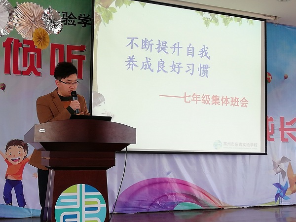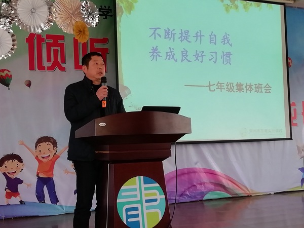 大会有三个流程:一、请七5班班主任卢申辉老师为我们做一个讲座;二,两名优秀学生给我们分享他们良好的学习和行为习惯。三,对一些行为习惯不好的同学进行批评教育。