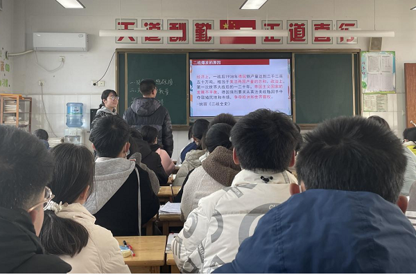 上午第二节课在九(5)班教室,张爱苹老师给我们带来了一堂历史汇报课《第二次世界大战》,张老师通过一幅漫画导入课堂,由复习一战内容自然连接到二战爆发原因,详细展示了二战初期进程以及形势的逆转,讲述了几场关键战役还有雅尔塔会议的相关内容,整节课堂内容详实丰富,节凑紧凑流畅。
