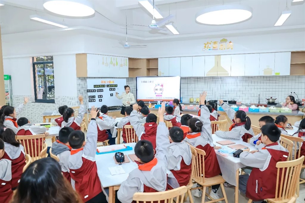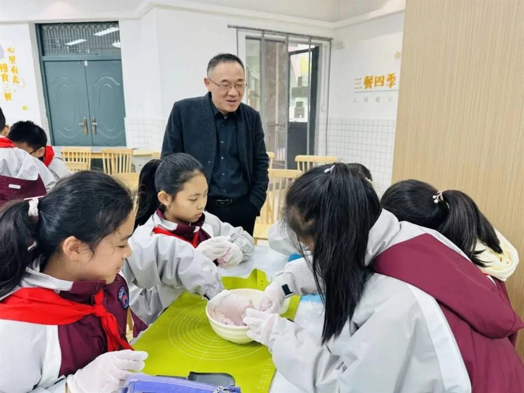 课题组吴萍老师在一楼的“欢喜厨房”里执教《彩色小圆子》,基于学生生活中的实际问题,将四年级劳动课程中揉面技术、学校“梦幻花园”街区中学生亲手种植的健康无污染的蔬菜以及科学课中的实验材料都利用起来,借助“欢喜厨房”这个天然的场地,形成了这样一节科学与劳动跨学科融合的课例。为课题组老师们跨学科研究之旅,拉开序幕。